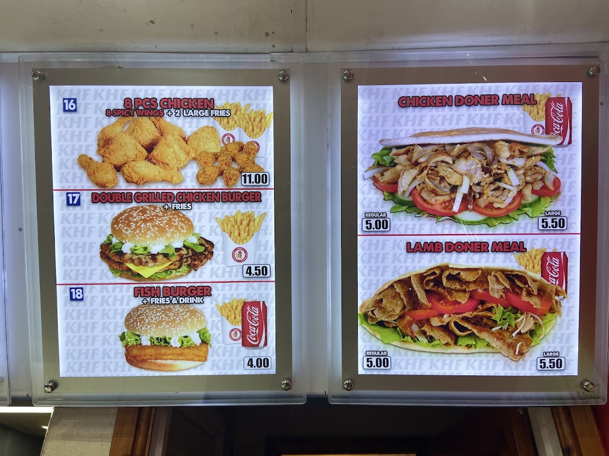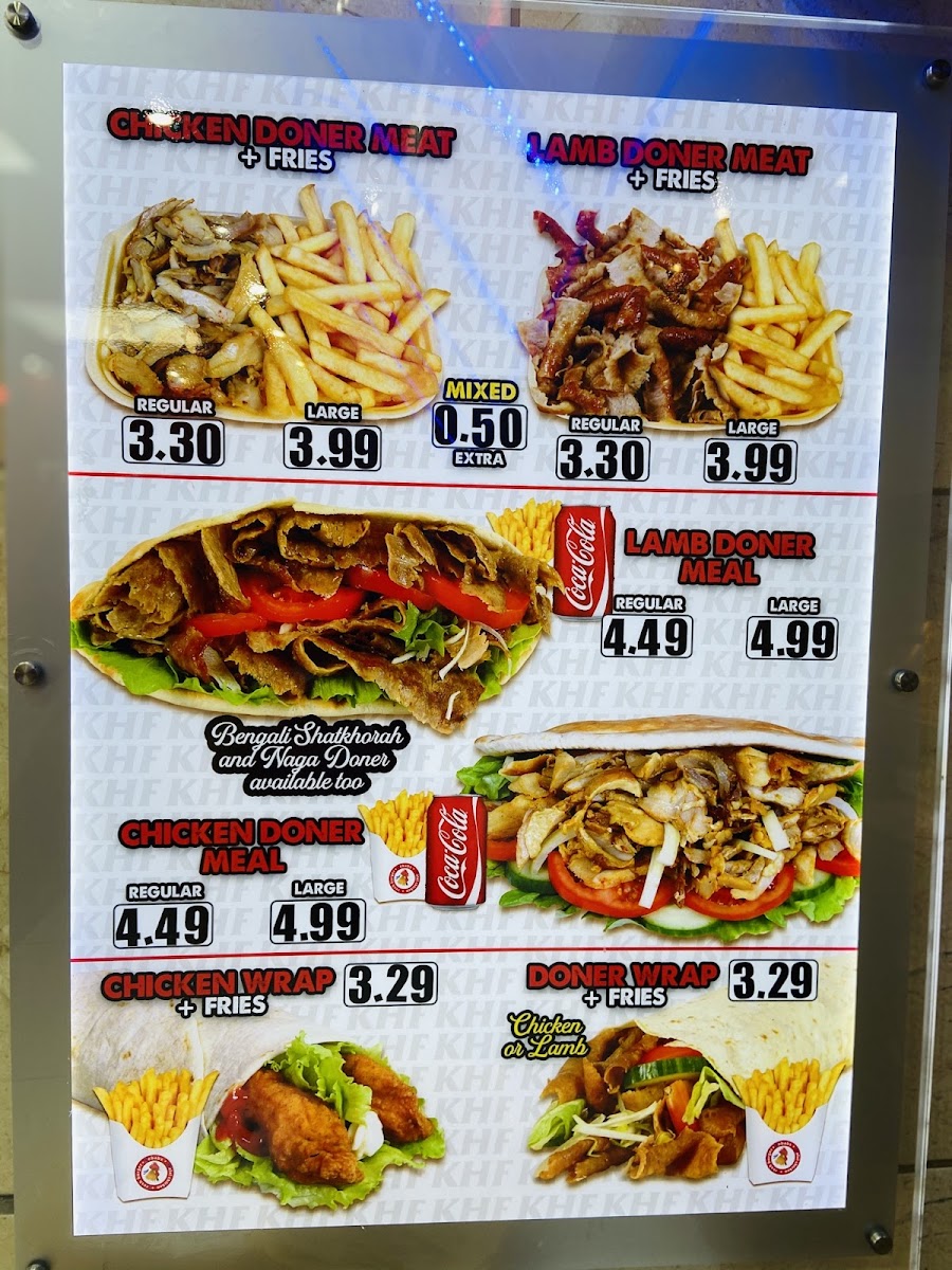 Get ready to indulge in a mouthwatering array of dishes at KHF STEPNEY, located at 210 Mile End Rd, London. Our menu highlights include the savory Chicken Fillet Burger, the satisfying Lamb Doner with Wings and Fries, and the irresistible Donner Kebab and Chips. Don't miss out on our fan-favorite items such as the Satay Chicken, Naga Doner, and Grilled Chicken Burger and Wings and Chips Meal. Complete your meal with a refreshing Cola or Prawn Crackers, and you'll be coming back for more in no time. Come give us a try and experience the flavors that have made KHF STEPNEY a local favorite!